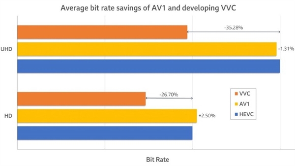 另外,为了全球视频行业繁荣,MPEG组织也正推动H.266/VVC及两个衍生标准MPEG-5 Part 1(EVC)和MPEG-5 Part 2(LCEVC)。根据英国组织的测试,相较于免费的竞争标准AV1,VVC具备明显优势。