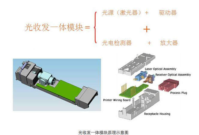 光收发一体模块(Optical Transceiver)光收发一体模块是光通信的核心器件,完成对光信号的光-电/电-光转换。由两部分组成:接收部分和发射部分。接收部分实现光-电变换,发射部分实现电-光变换。
