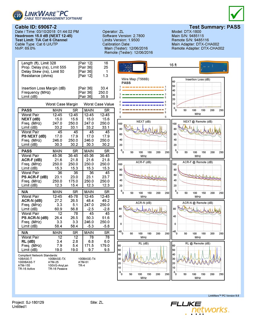 cat6网络跳线已通过福禄克信道测试。下图显得NEXT、PS NEXT、ACR-F、PS ACR-F、ACR-N、PS ACR-N和RL都在允许值内,并且NEXT和PL的值明显优于行业标准。