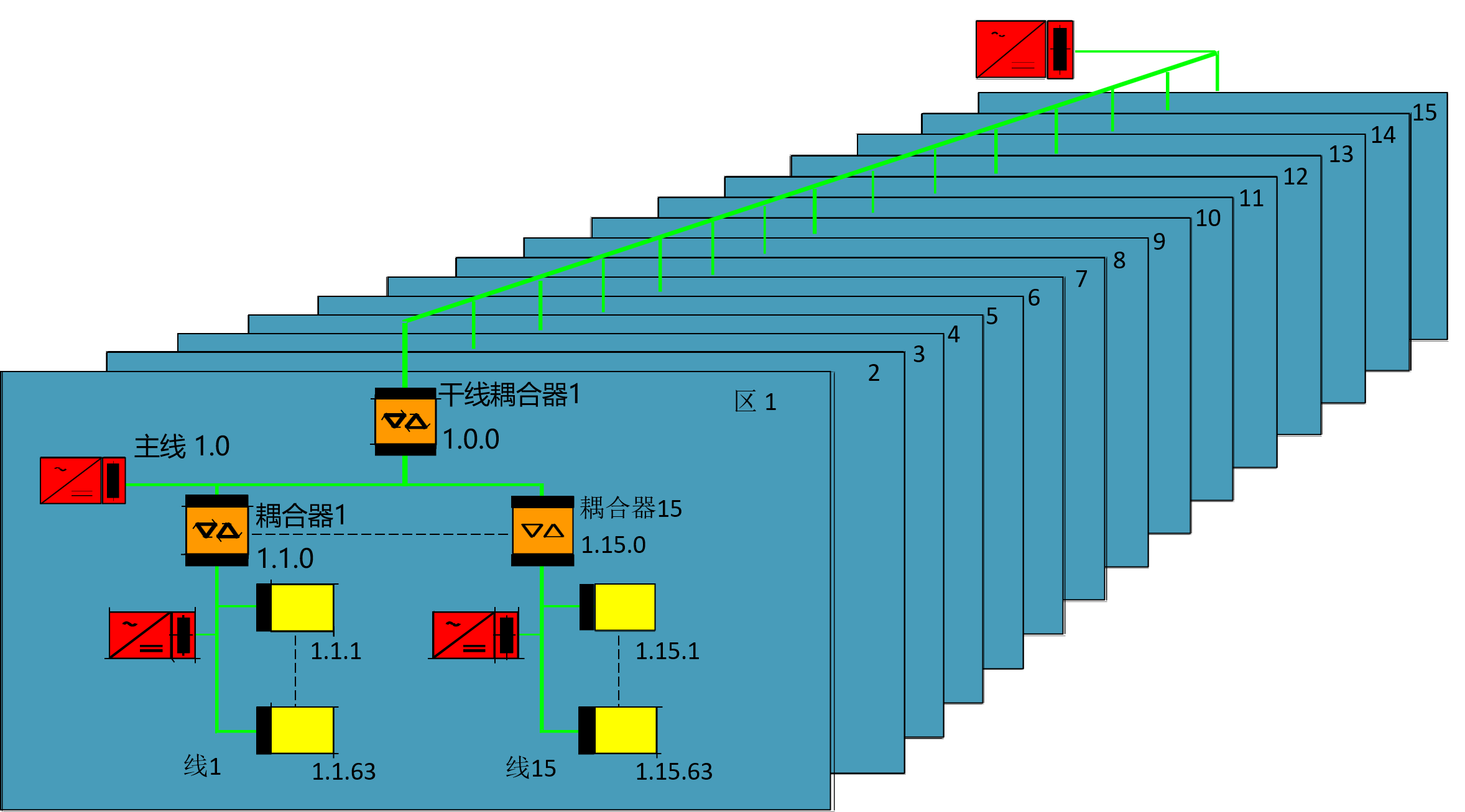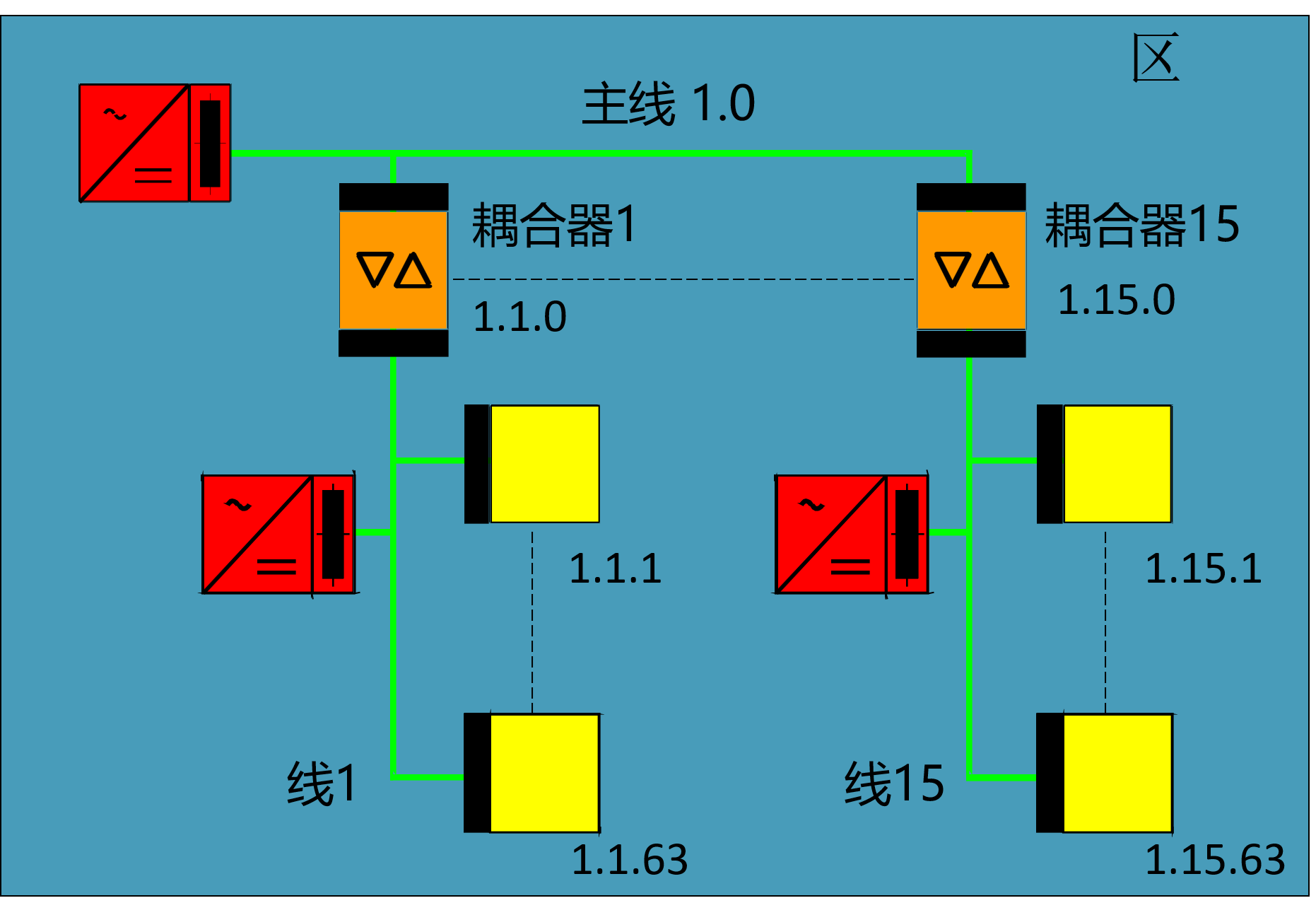 每个区可包含15条线,每条线通过耦合器与主线连接,每条线都有一个系统电源给总线设备提供电源。