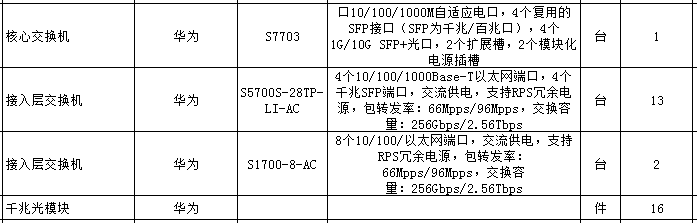 主要看组网的拓扑才可以准确的计算光模块的数量,从清单看,S1700-8-AC型号交换机是没有光口的,上行接口接到了S5700S-28TP-LI-AC型号的交换机,千兆光模块有16块,说明只有四个汇聚交换机到核心交换机使用的光模块。(光模块是成对使用的)