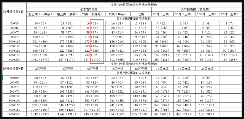 这个表示的是没有括号的是按线槽截面利用率为30%和50%时能容纳的线缆根数,