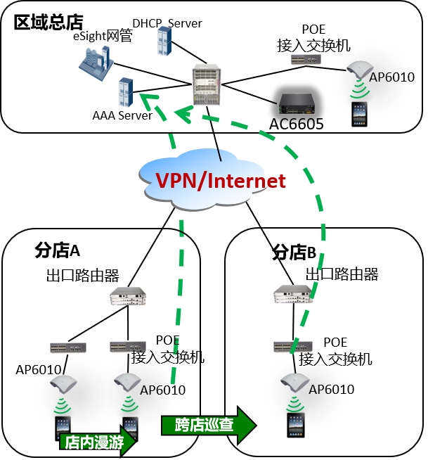 为你默哀三分钟·······················································   华为给出的解决方案应该是其他商场的无线网络与办公网络与总部走的是VPN专线,这样的话,其他分店无线网络部分只要接AP就好,所有的认证和管理都在总部这边。   我这样说,应该是你看了也不怎么明白,我也不太清楚怎么表达,你才听得懂,所以特意去找了华为无线网络的解决方案系统图,你看系统图应该明白了,不明白再问。
